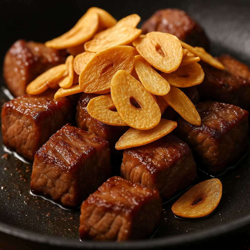 這次我們搭配多汁骰子牛,讓【黃金蒜片】不只是配角,而是讓整道料理香氣爆棚的主角香料。每一口肉香都被蒜香包圍,簡單灑上幾片,就讓整盤菜立刻升級成職人等級!