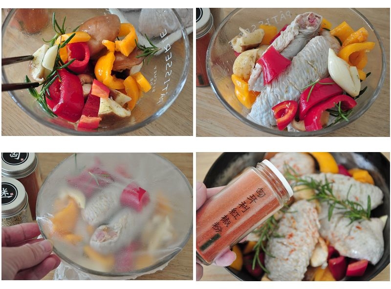 1)將彩椒及香菇放入香料橄欖油拌勻。
