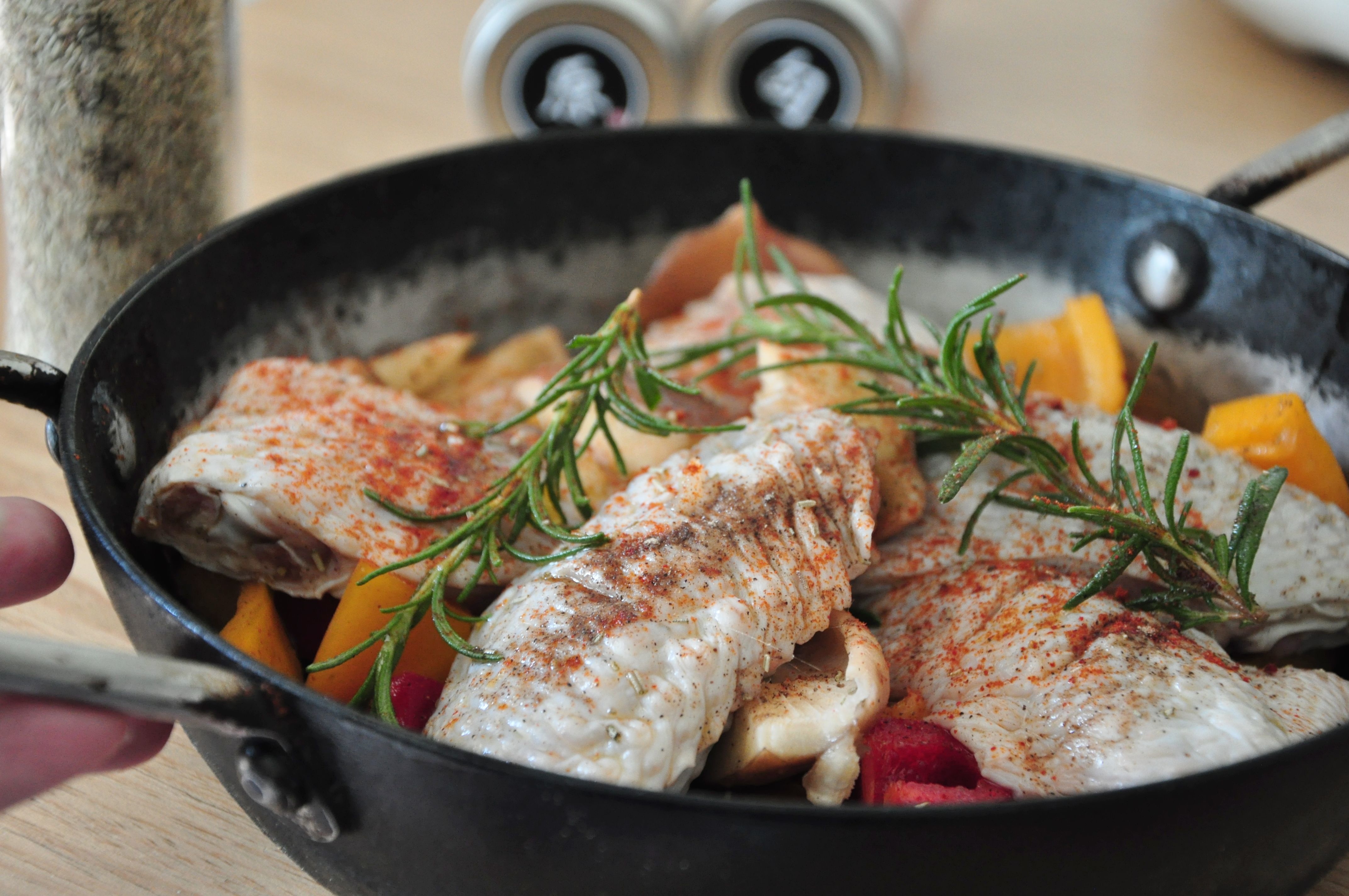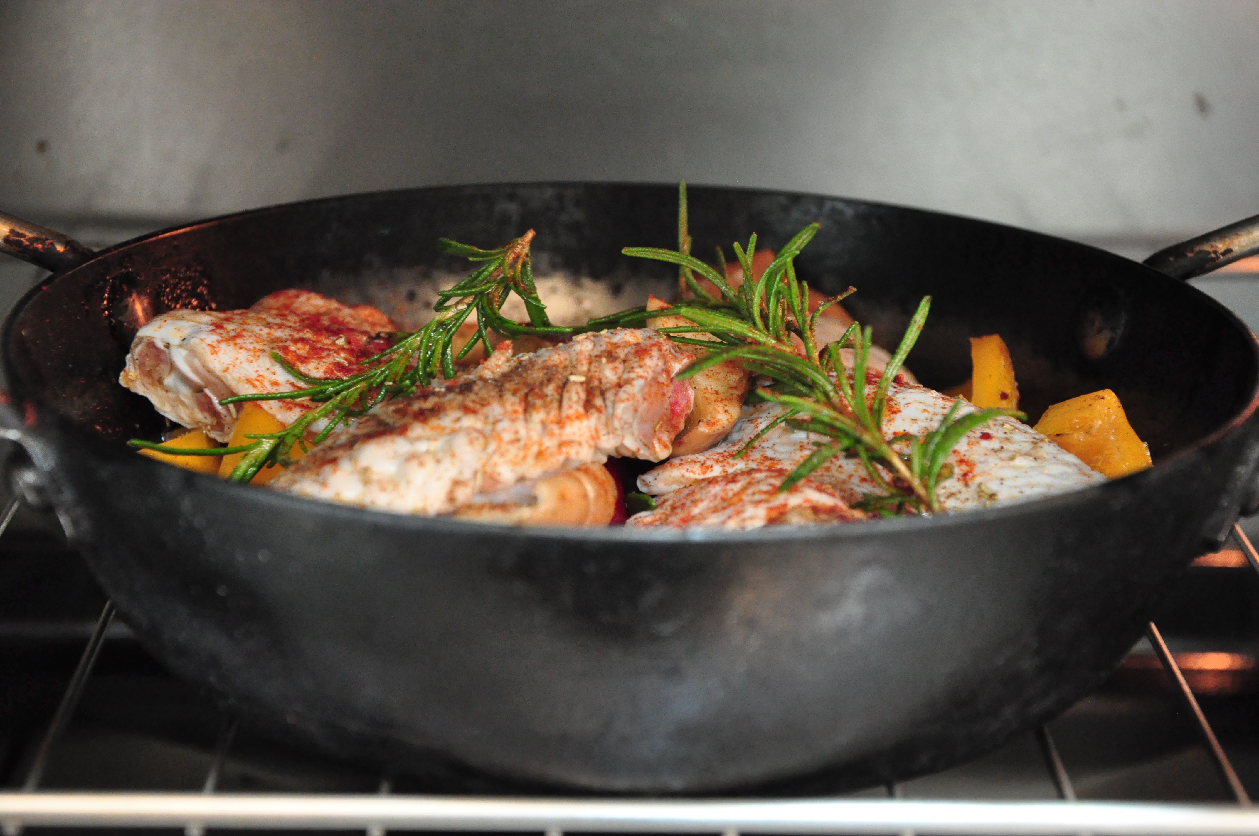 5.烘烤約10~15分鐘後,取出烤鍋,再沾上鍋內香料油均勻塗抹雞翅表面,於表面放上切塊奶油後續烤。