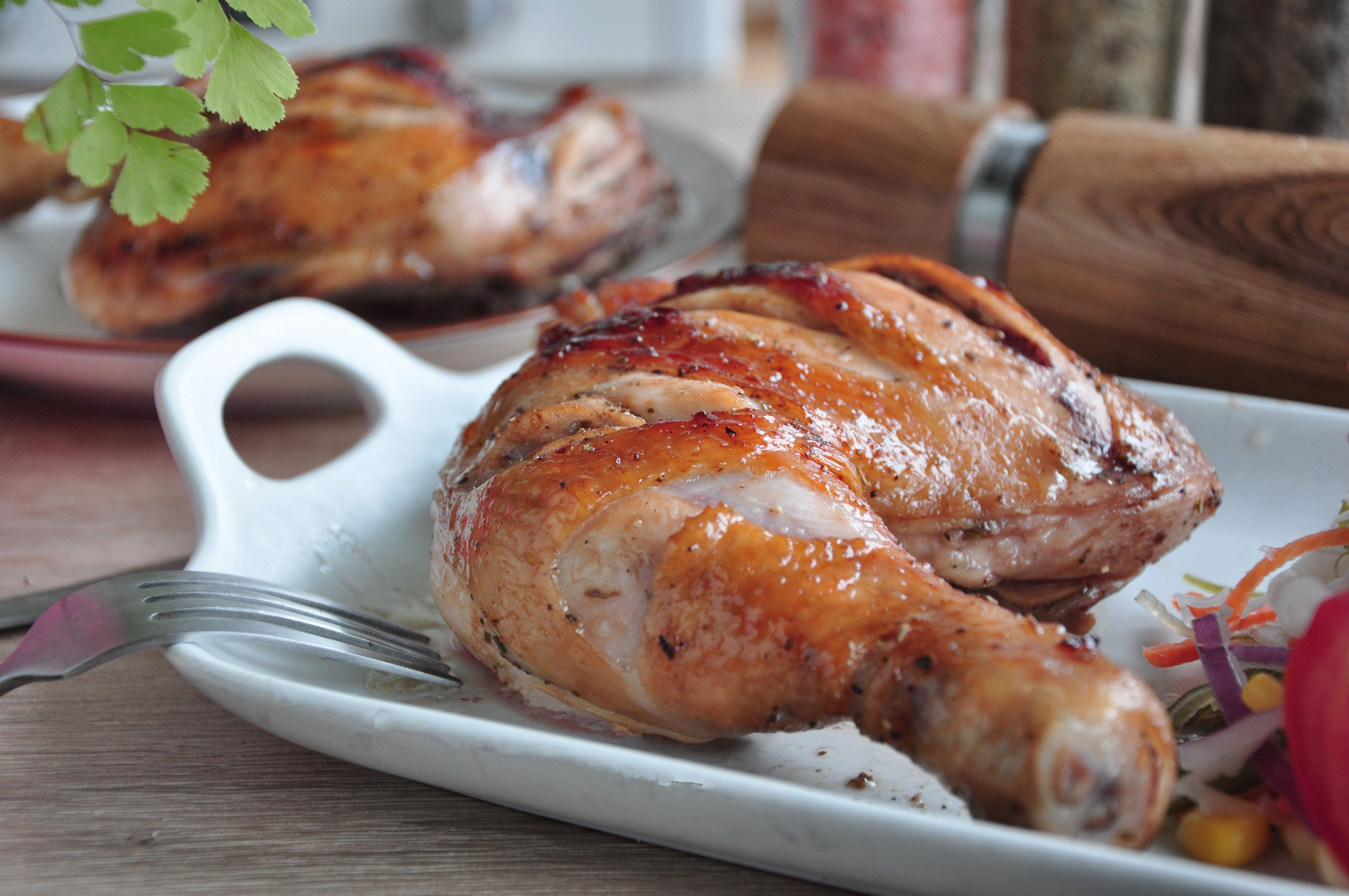 用香料醃漬雞腿水煮再烘烤,不但香料更入味,烘烤也不擔心靠近骨頭的雞肉不熟,雞肉一樣多汁滑嫩可口喔!