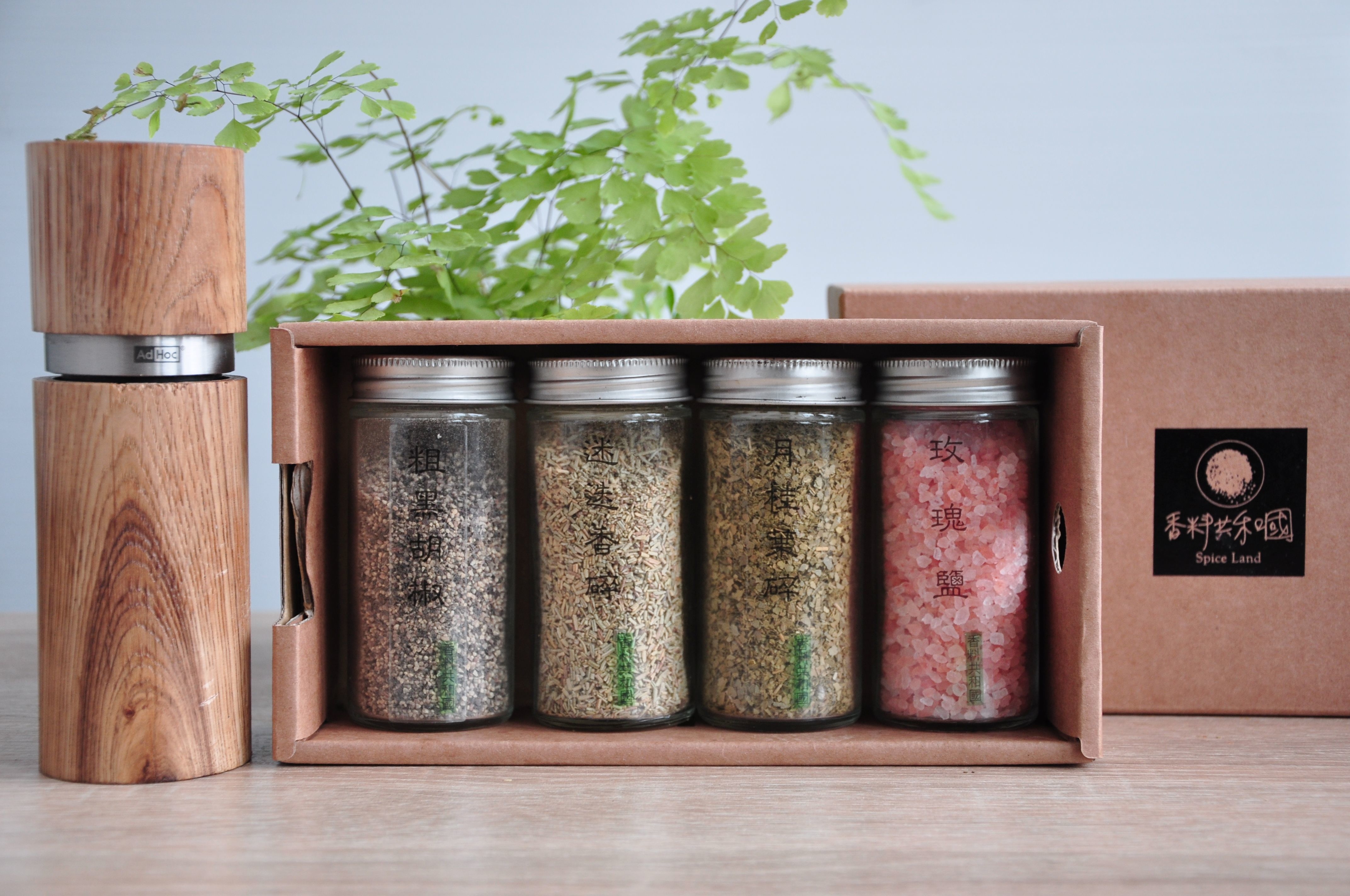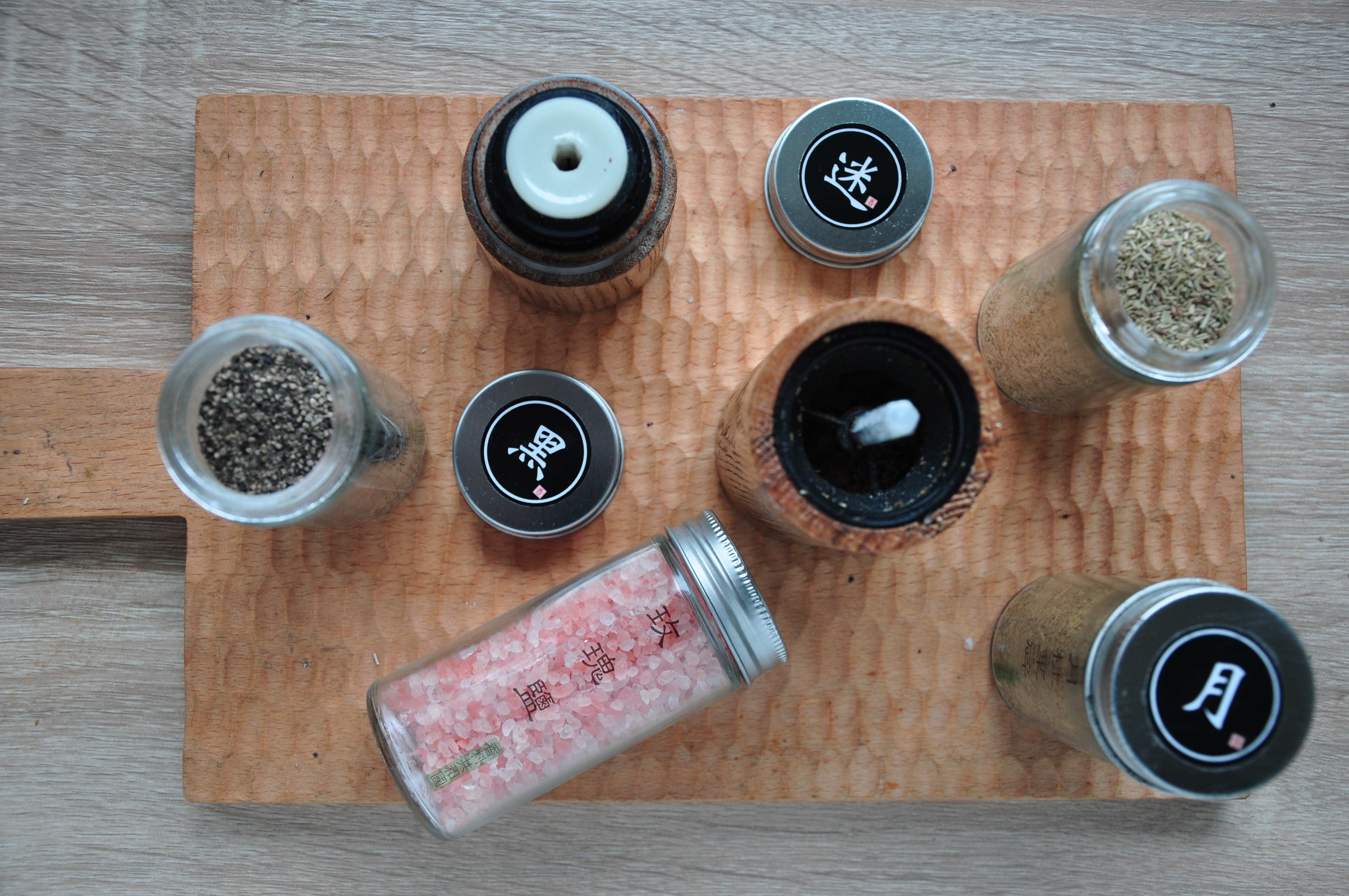 2以綠、黑、紅三種胡椒粒搭配玫瑰鹽作為綜合研磨香料。