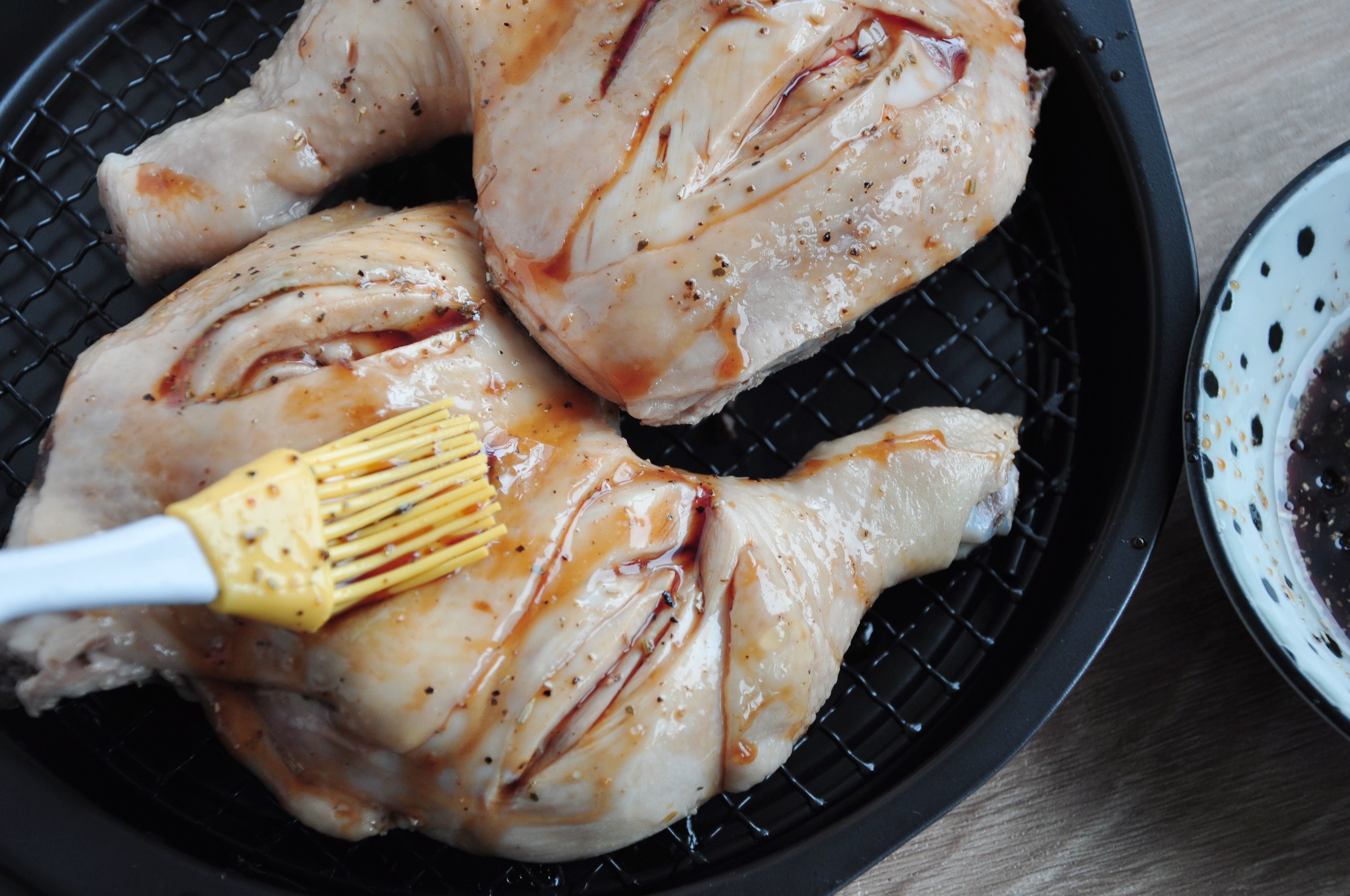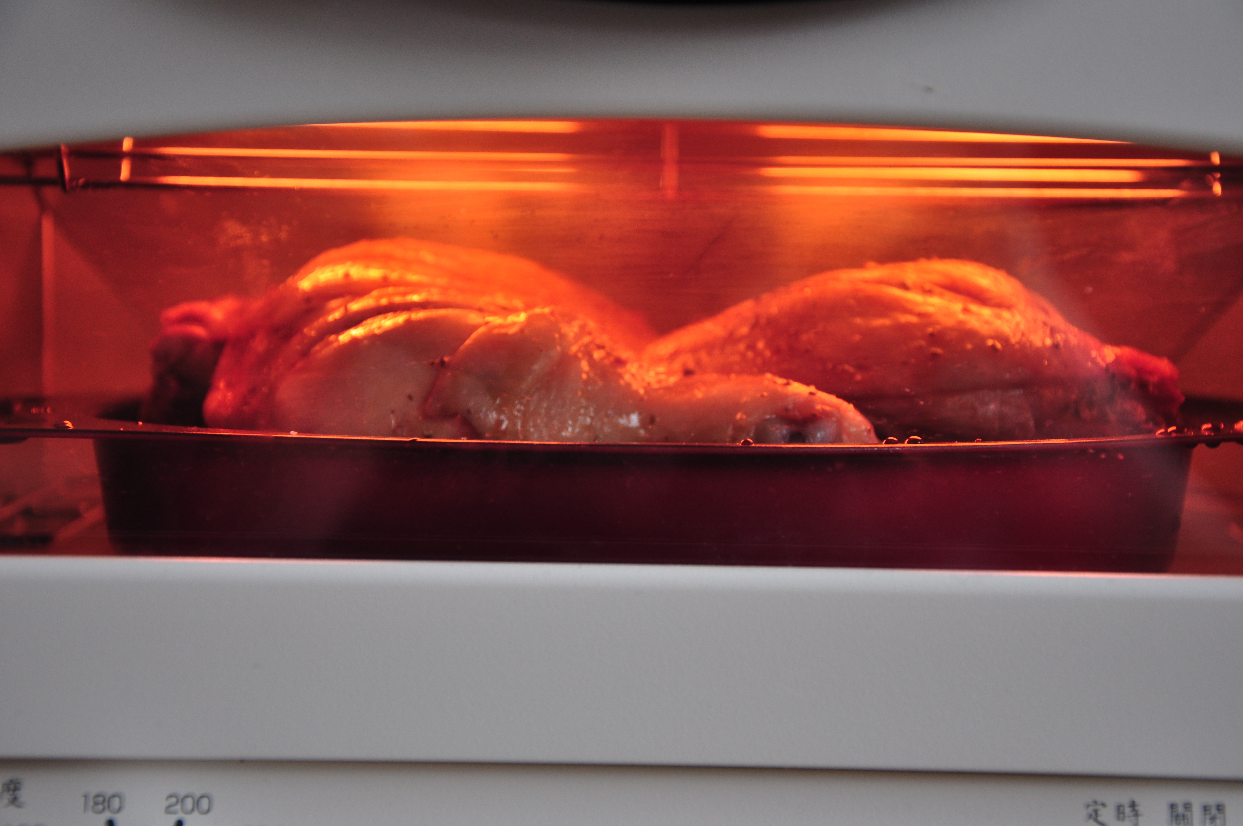 6取出雞腿放入烤盤,再塗抹自己條配的香料醬汁。