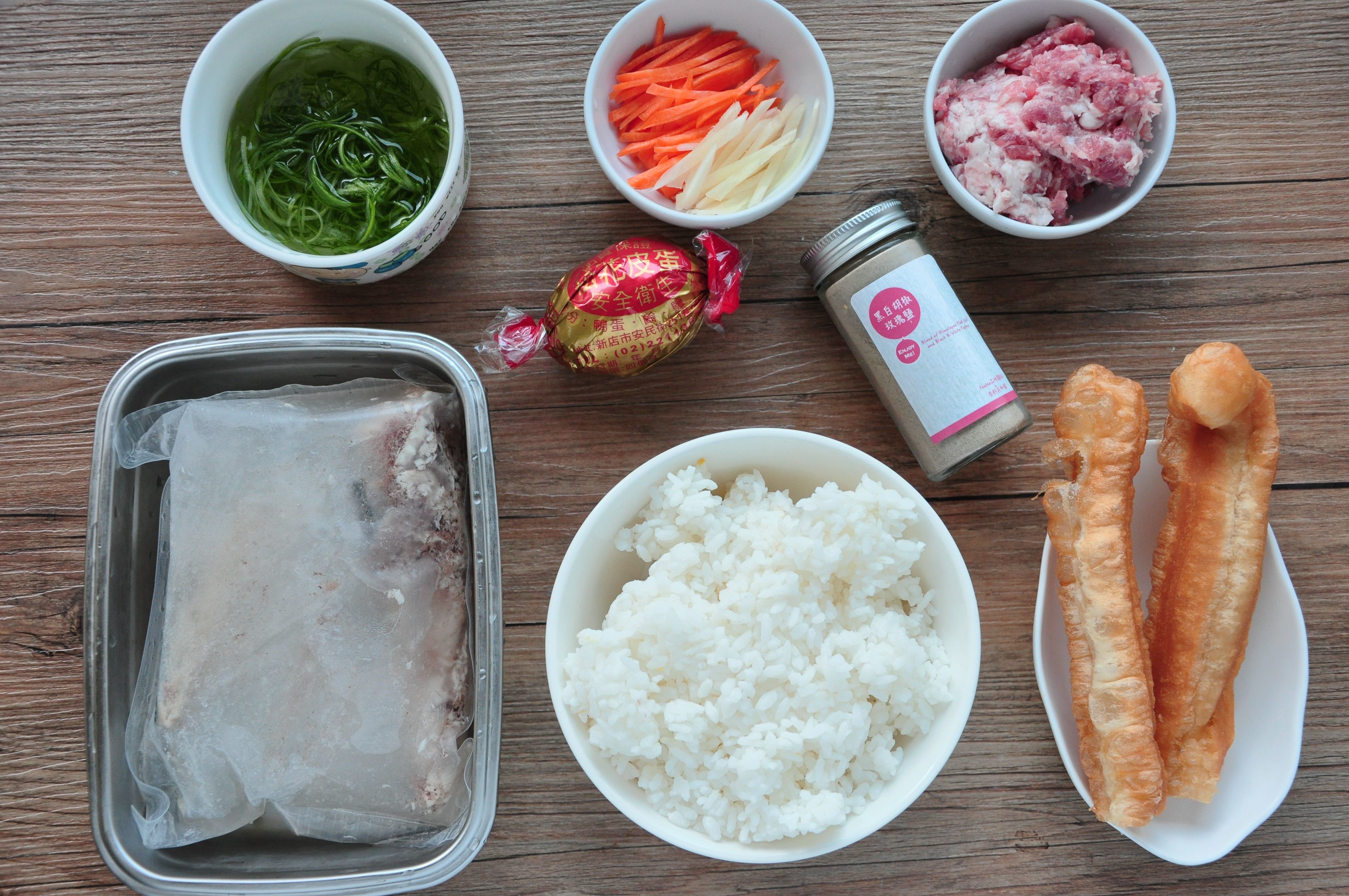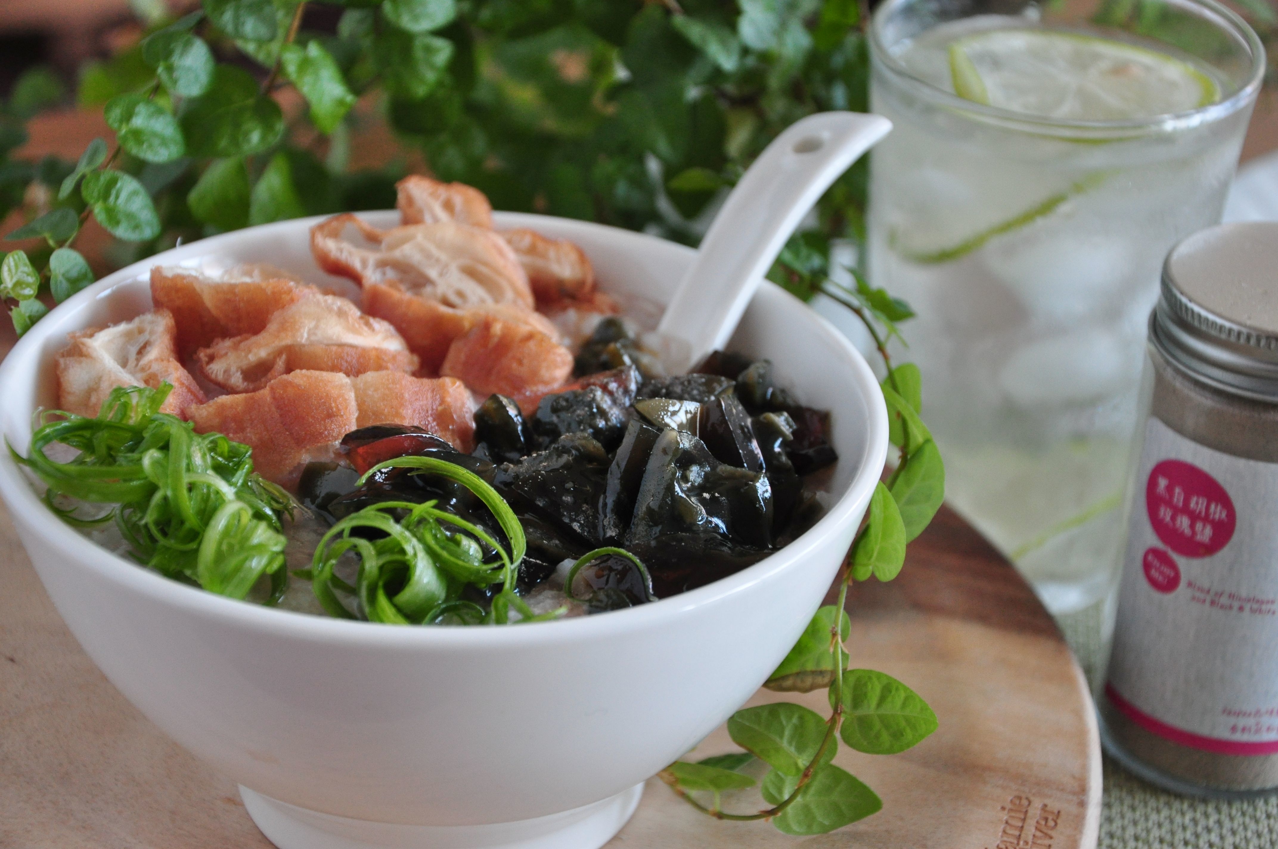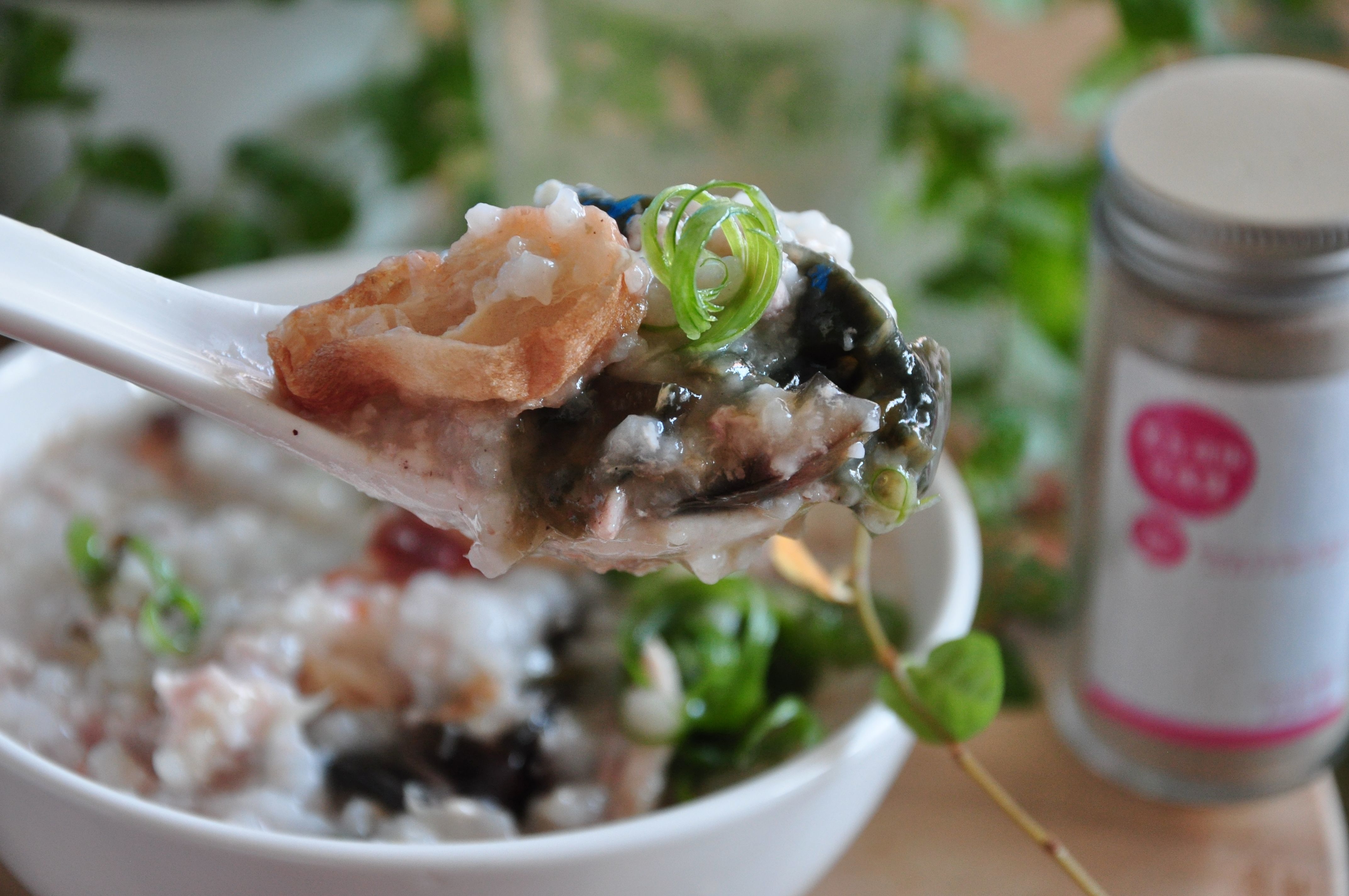 5.另外將備妥蔥絲、碎皮蛋、油條與燉煮完成的粥品搭配組合。