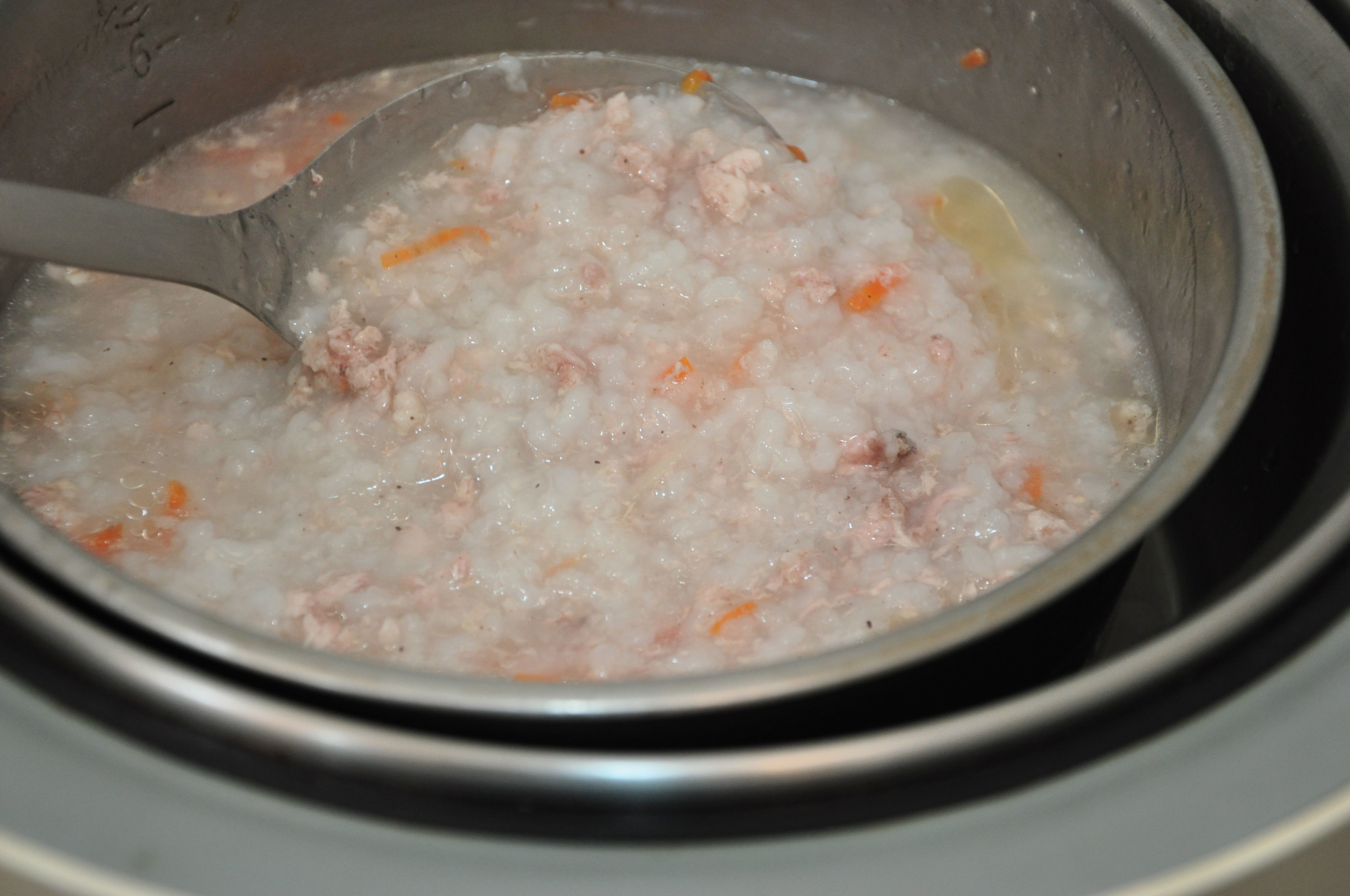 3.將米飯、紅蘿蔔絲、嫩薑絲、豬絞肉(亦可以先略炒過)及熬煮的虱目魚湯底放入電鍋內鍋再撒上適量的黑白胡椒玫瑰鹽,外鍋注入1米量杯水進行燉煮。