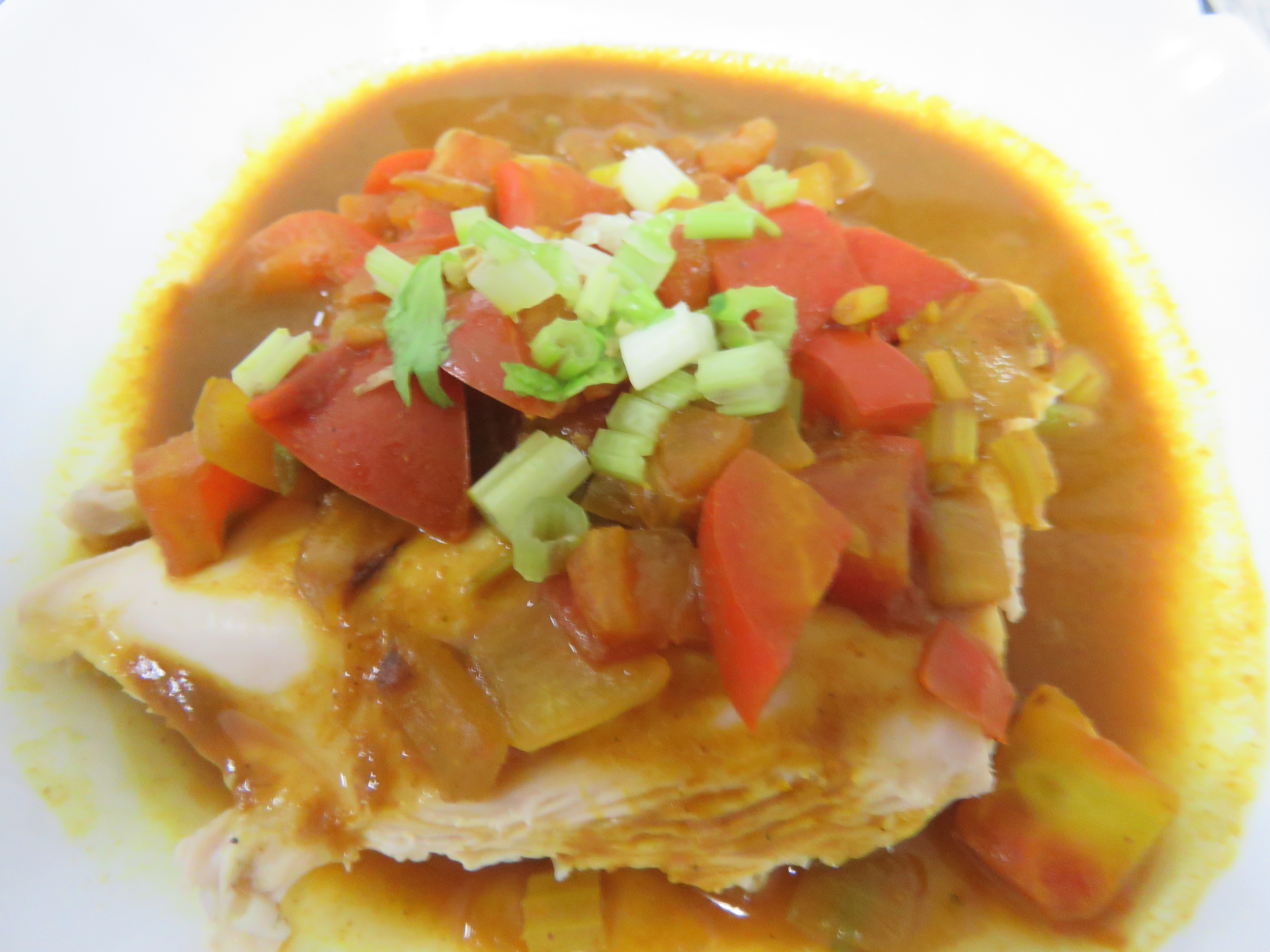 7.將煮好的咖哩醬汁倒入雞胸肉中再把切好的芹菜末放入就完成囉