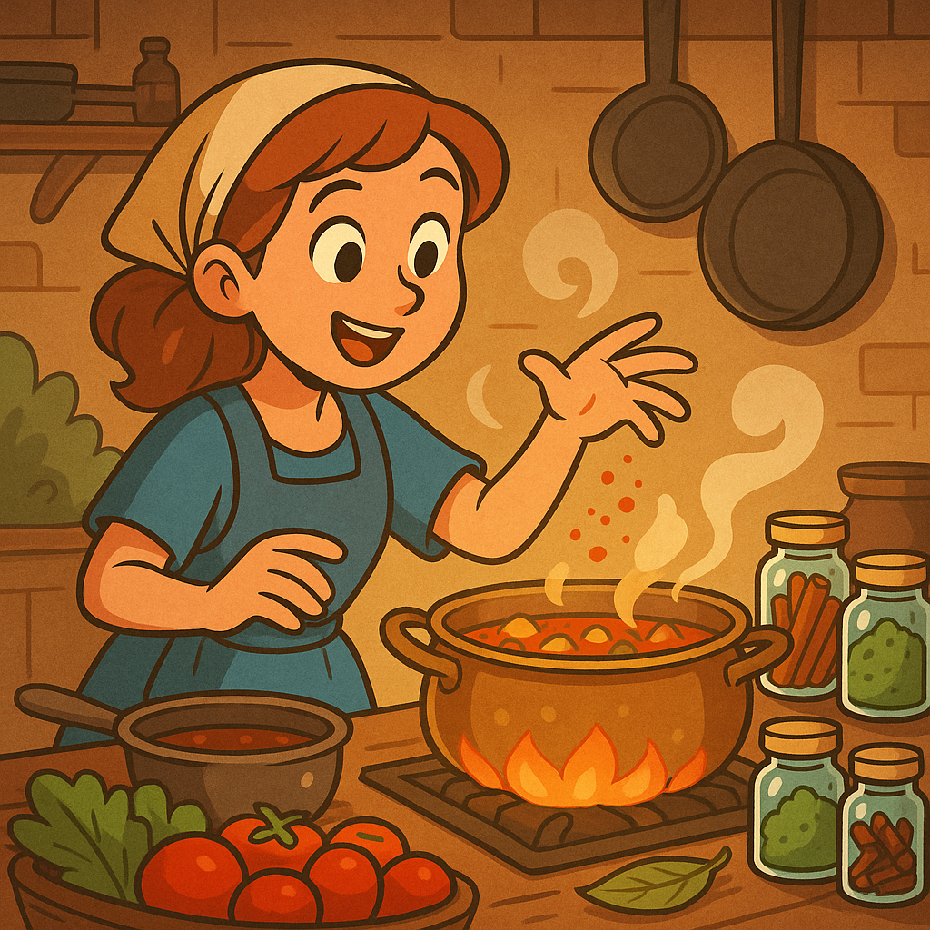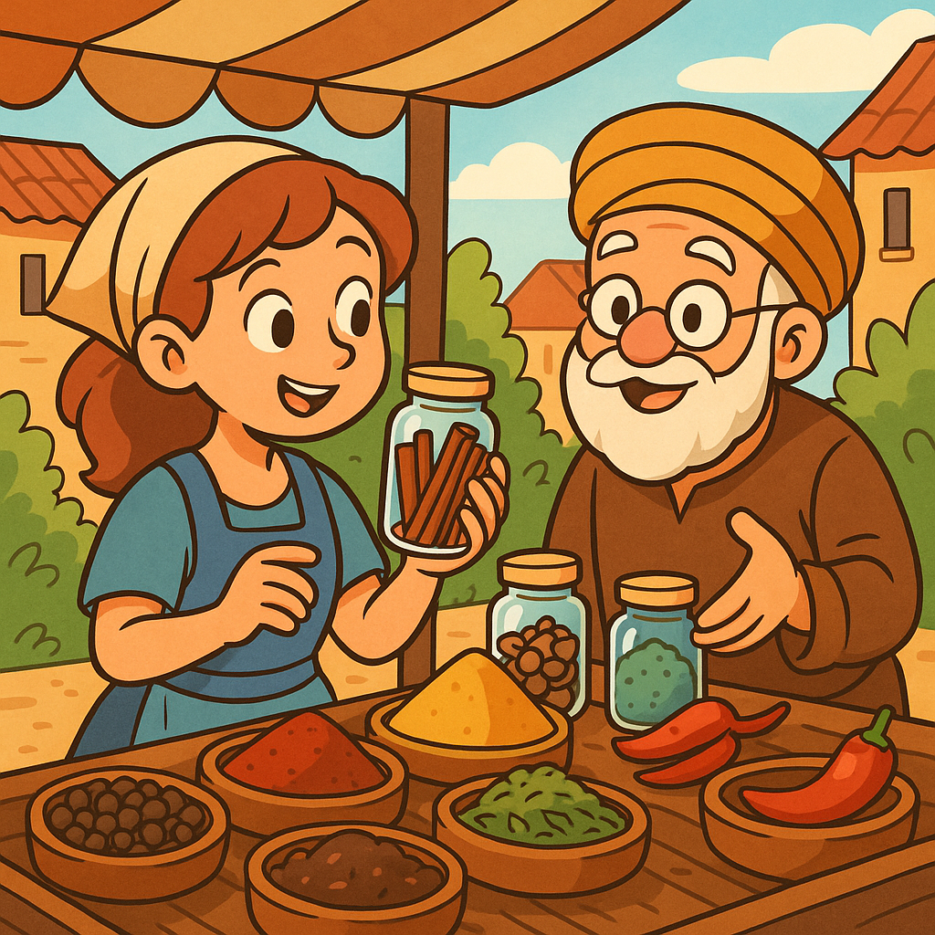 一天,艾莉走進村外的市場,偶然遇見了一位老香料商人。商人手裡拿著各種各樣的香料罐,每一罐中都散發著不同的氣味——有的香甜,有的辛辣,有的清新。商人微笑著對艾莉說:“每一種香辛料都有它的魔法,它們能讓平凡的食材變成奇妙的美味。”