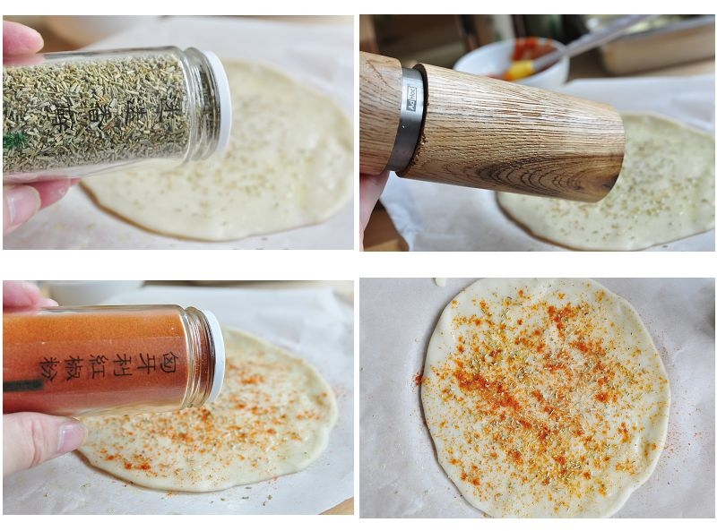8.一樣依照步驟2方式將餃皮做成薄餅,再依據喜好撒上不同香料,我放了迷迭香碎、匈牙利辣椒粉以及綜合研磨香料噴少許橄欖油,再放入烤箱烘烤約15~20分鐘即完成。